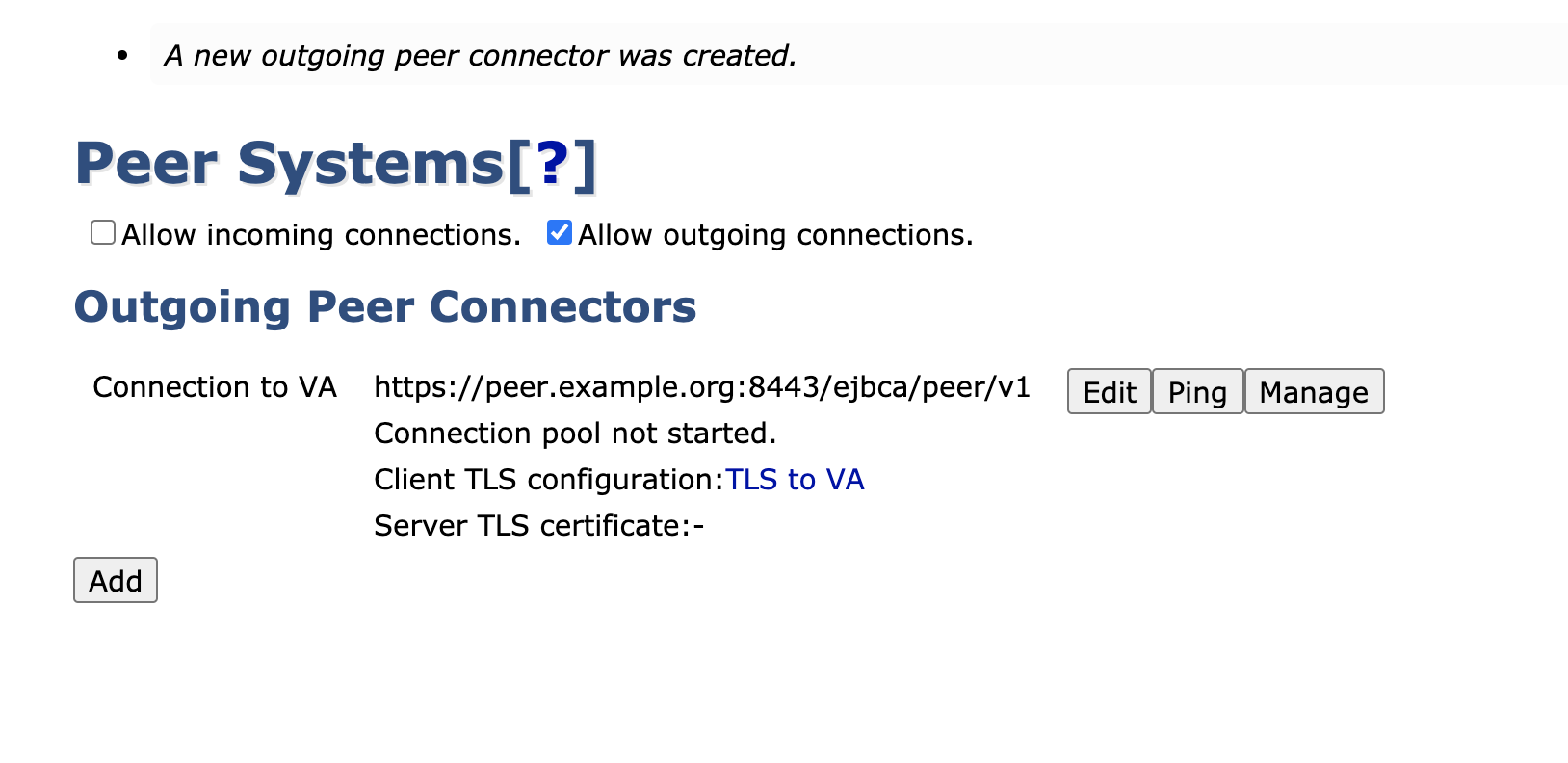 1. In the CA UI, click Peer Systems in the menu to view the Peer Systems Management page, then click Add to create a new Outgoing Peer Connection