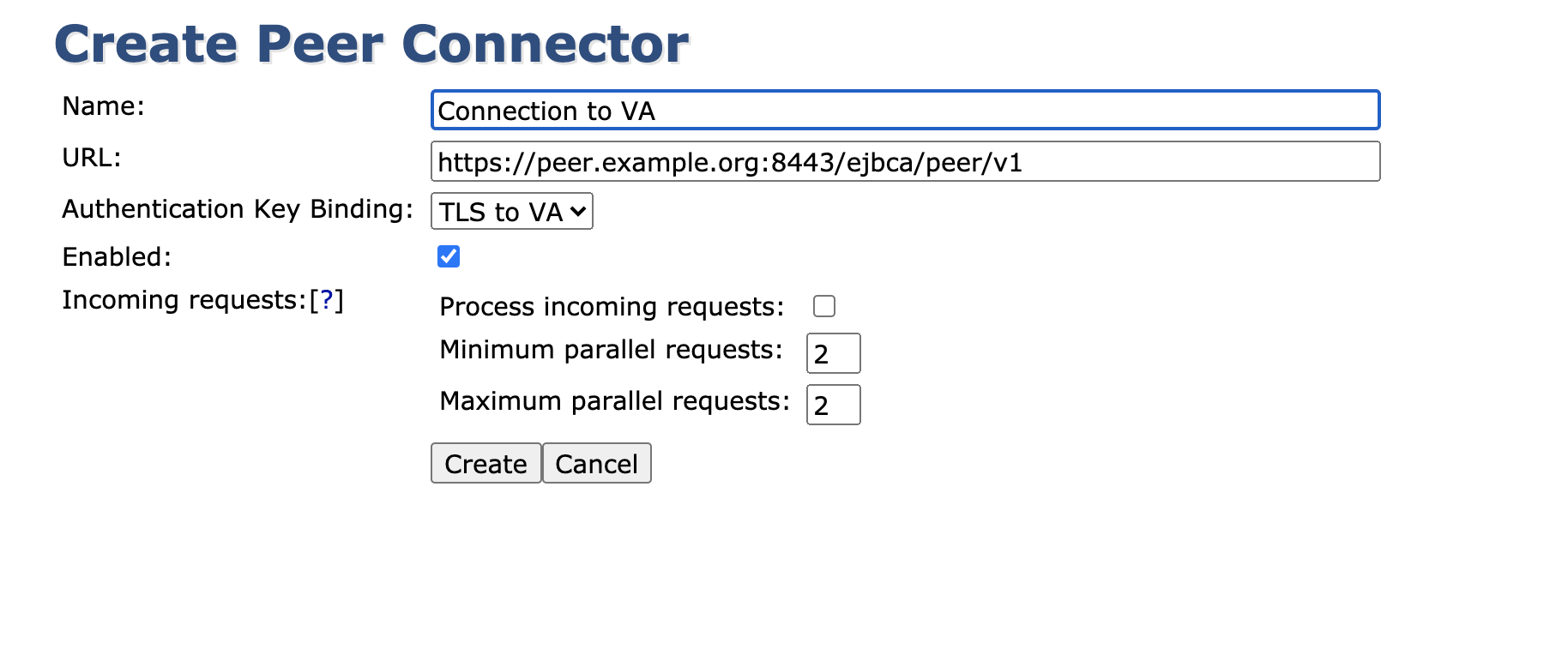2. Name the connector as desired, configure the URL to the downstream node and make sure that the correct Authentication Key Binding is selected. If this connector is going to serve an RA, select Process incoming requests (for a VA you may leave it disabled).