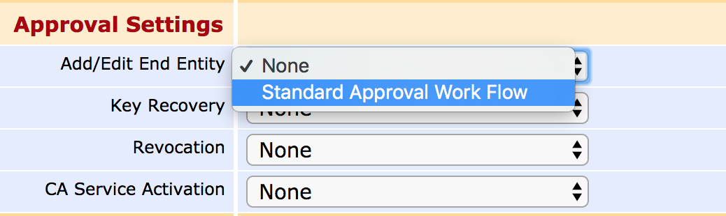 Some CA operations can be set up to require additional approvals, to allow lower level administrators to request that certain operations be performed and to require several individuals to sanction an action. The following actions can be configured for approval: