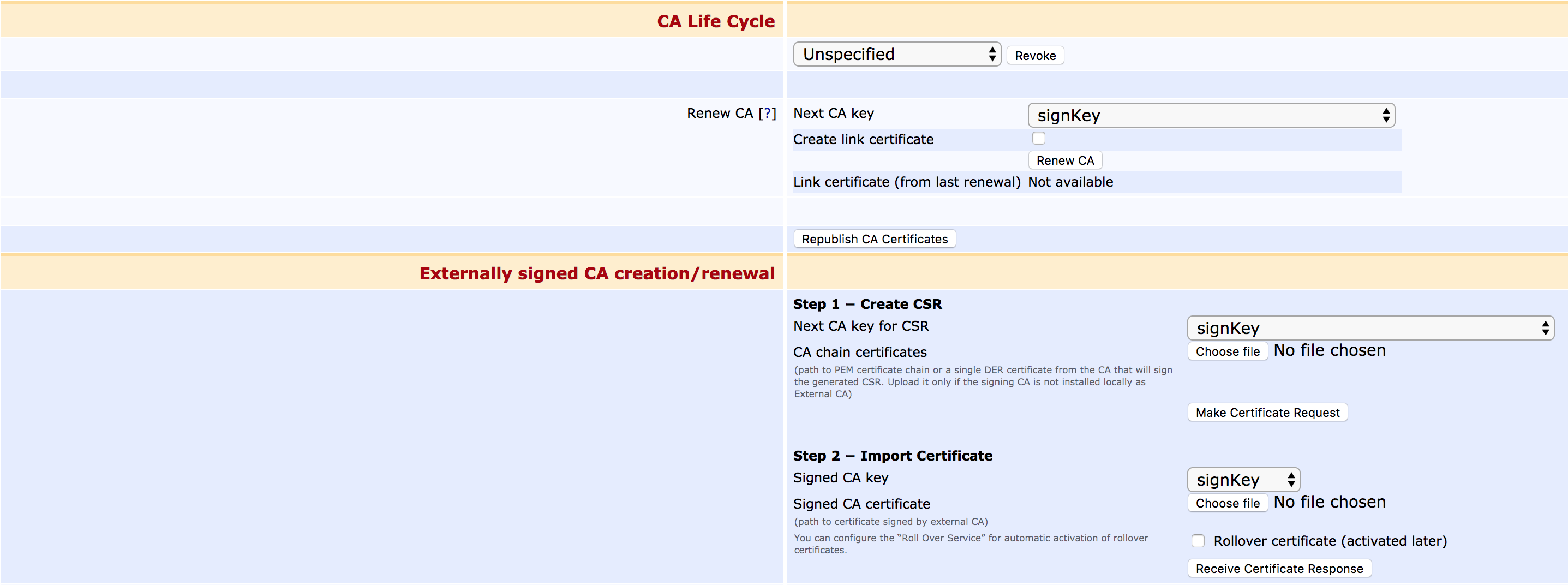- crlSignKey: The key to use for CRL signing. Even though it could theoretically be separate from the certSignKey according to the RFCs, client support is rare and the certSignKey will always be used.