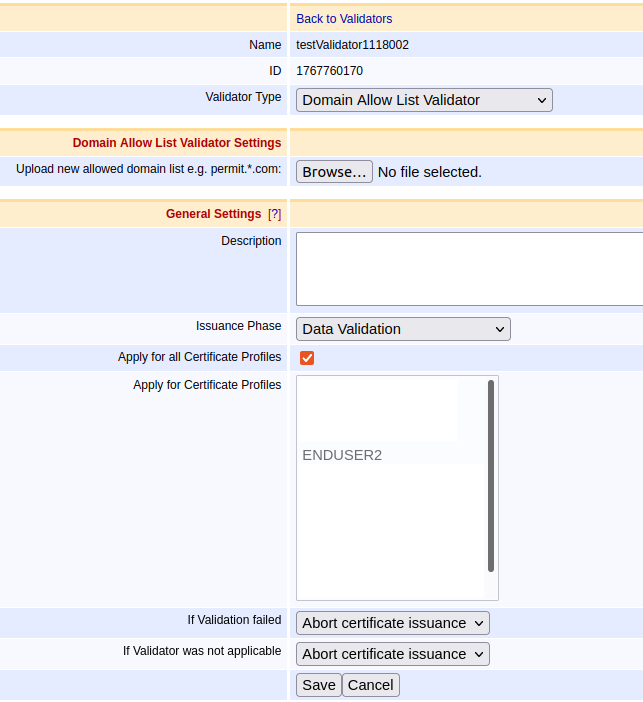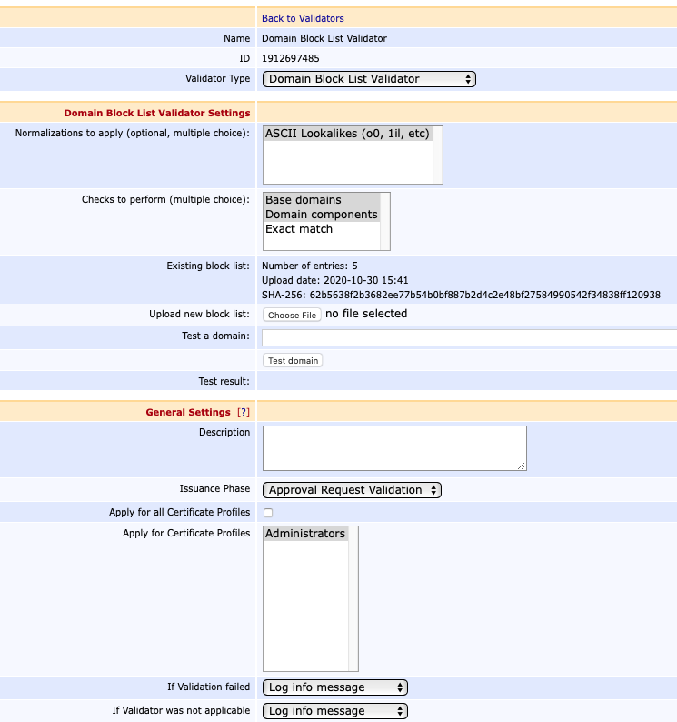 Domain Block List Validators allow DNSNAME attributes in Subject Alternative Name to be checked before issuance.