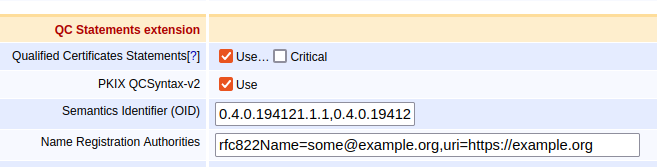 - Use Custom QC-statement String: Include this custom QC-statement in the QC-statements extension in the certificates.