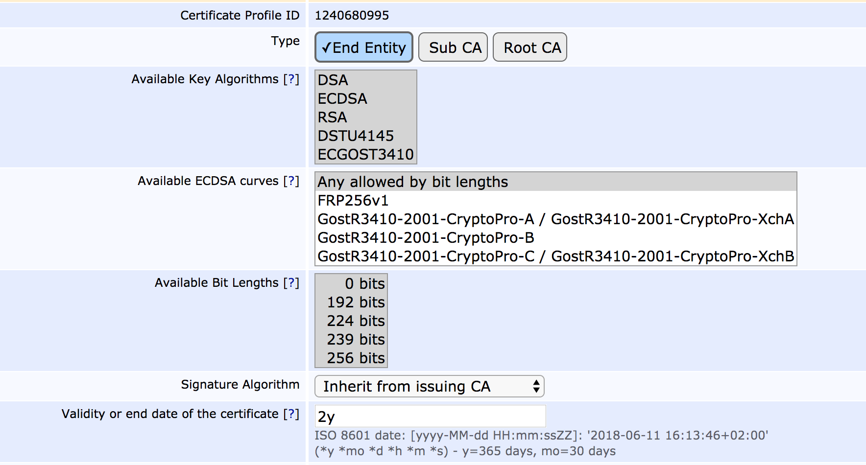To this end, the most noticeable fields in the configuration screen concern purpose, key algorithms and algorithm sizes.