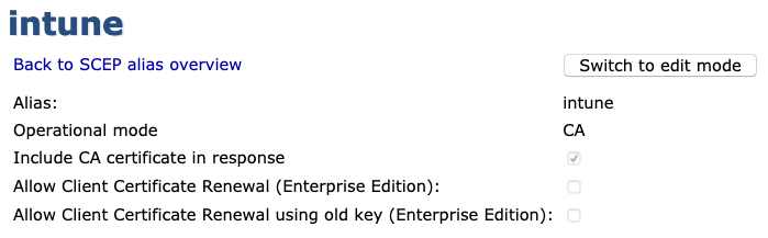 The alias name does not have to be intune - that name is used in this example to align with configuring EJBCA to integrate with Intune. - The new SCEP alias is added to the list of aliases. Next, proceed to configure the Intune SCEP Alias.