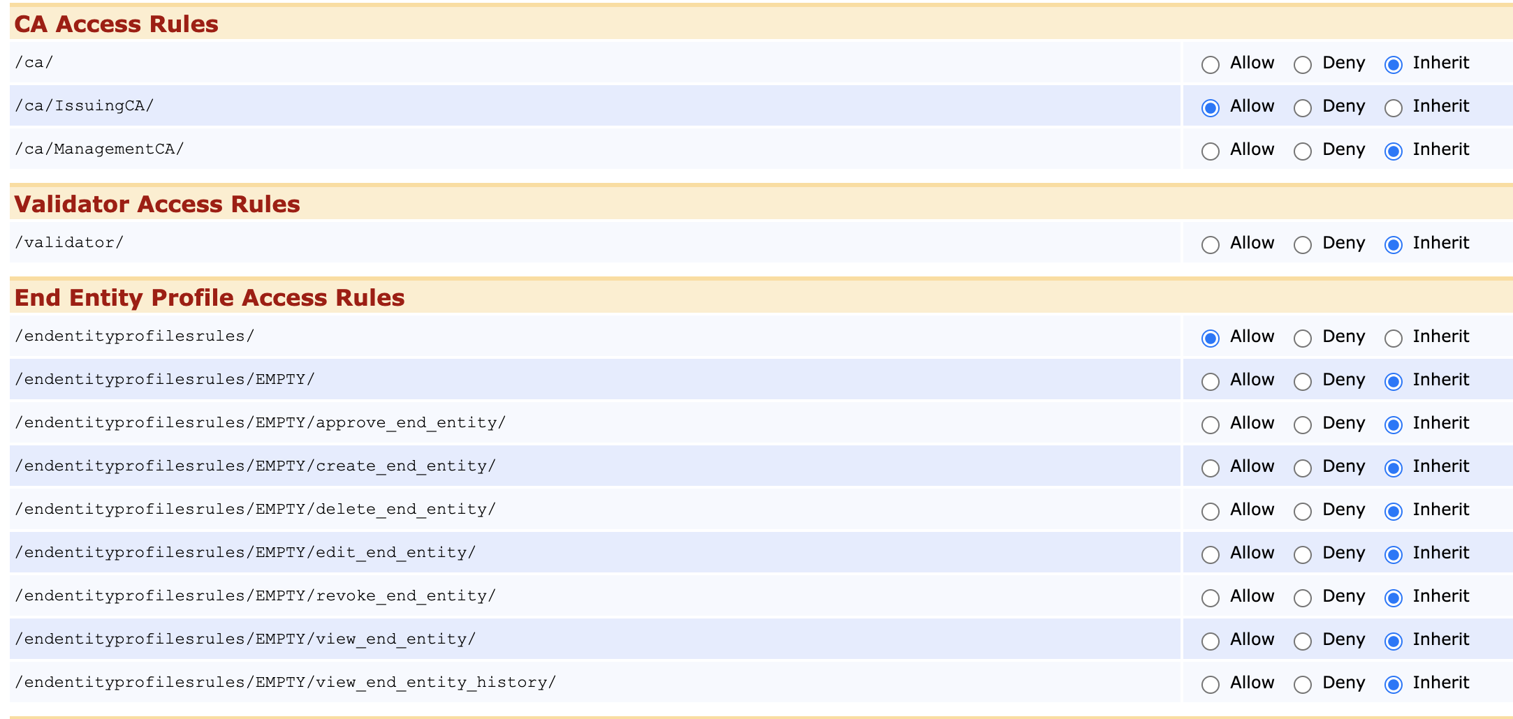- Optionally, to let the public user access to CA Certificates and CRLs page, they need to be given the access rule /ca_functionality/view_ca:
