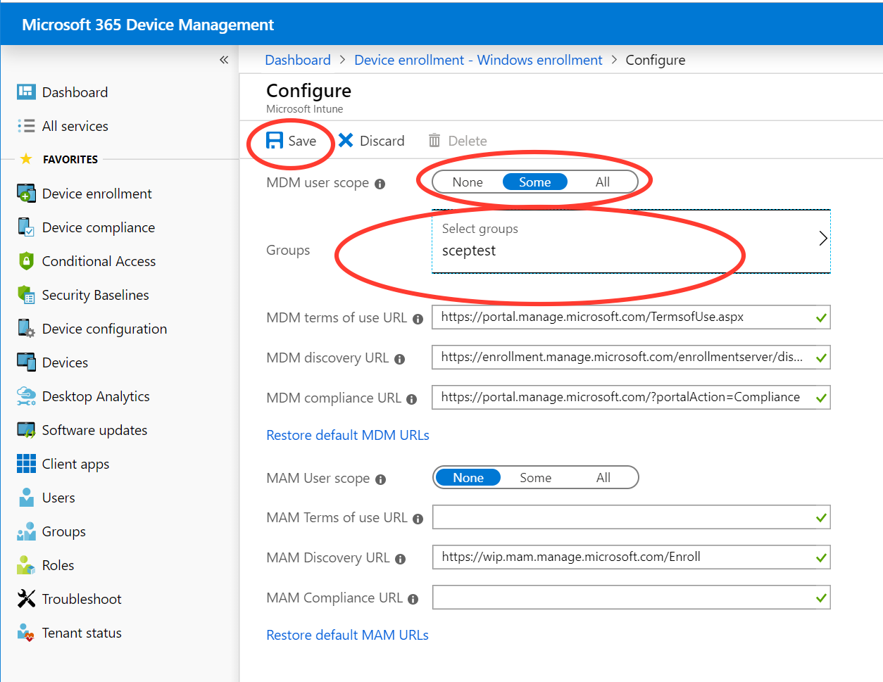 - On the Configure page, change the MDM user scope to Some, select group sceptest, and then click Save to store the configuration.