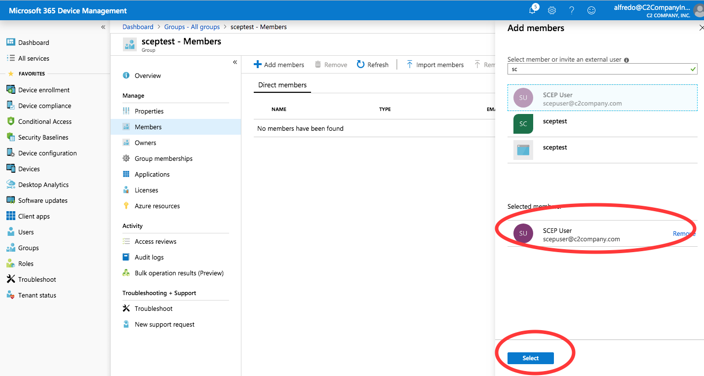 - Select the SCEP User and then click Select to add the member.