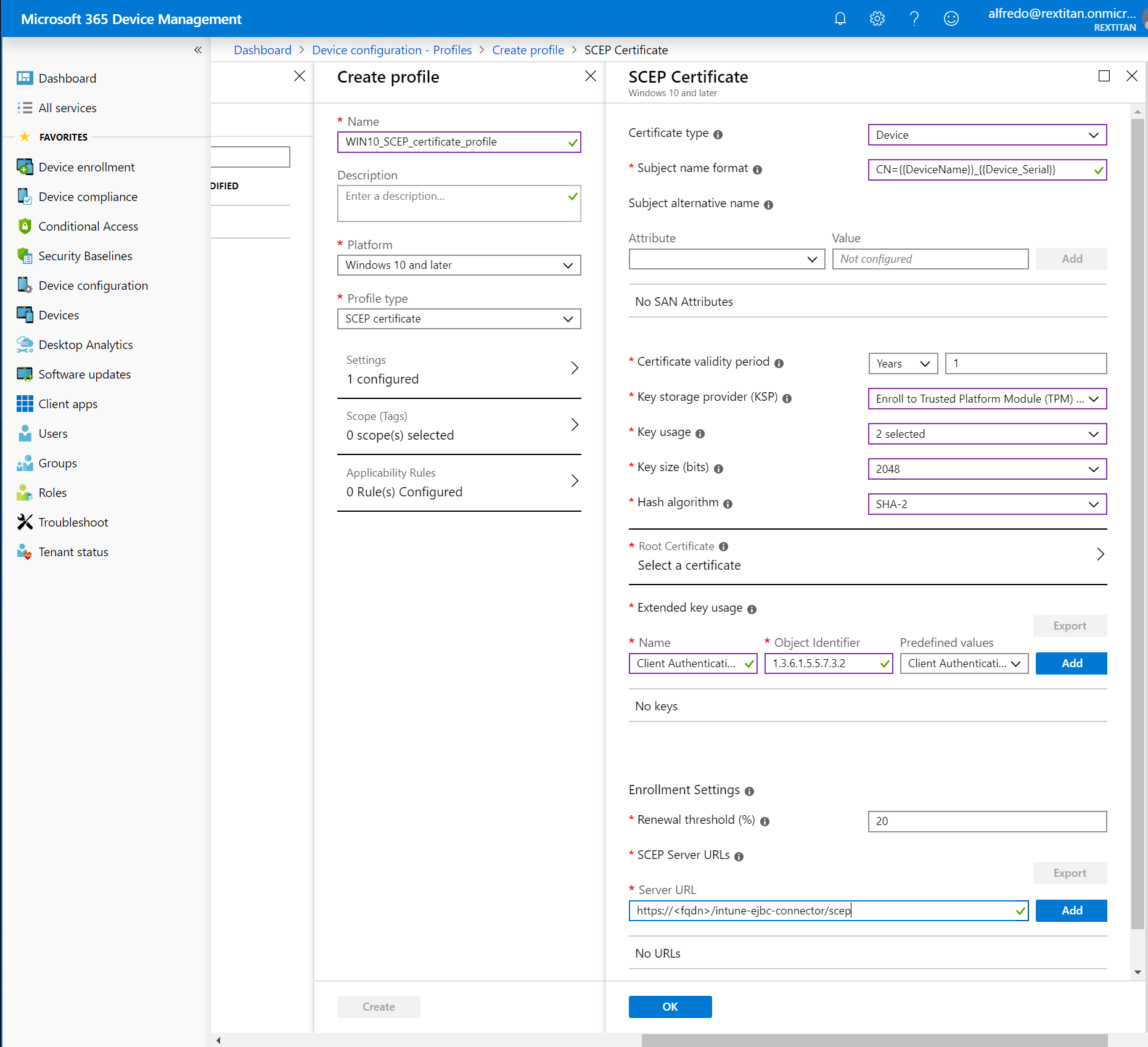 - Enter the profile Name: WIN10_SCEP_certificate_profile.