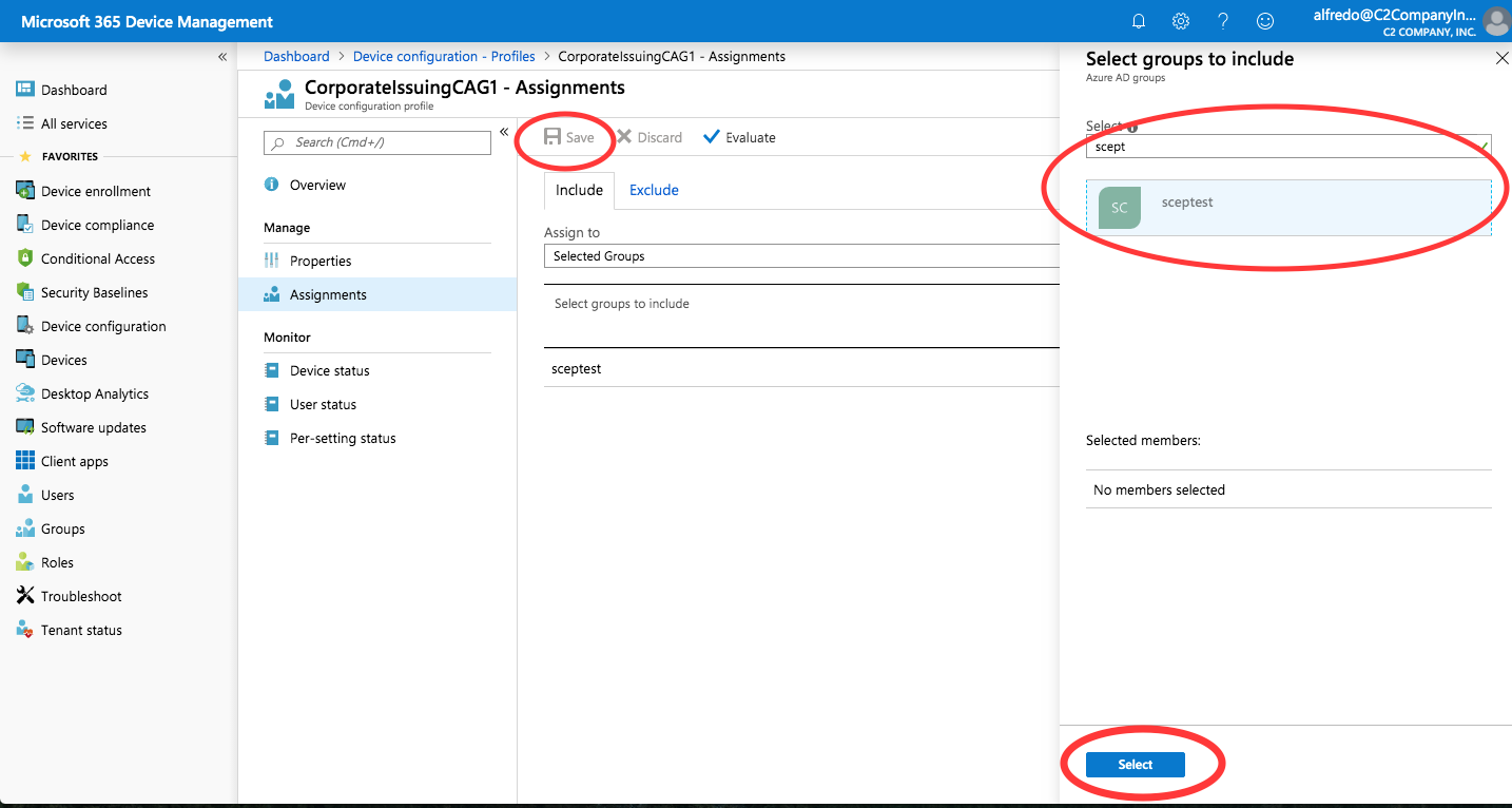 On the Select groups to include panel, select the sceptest group, click Select, and then click Save.