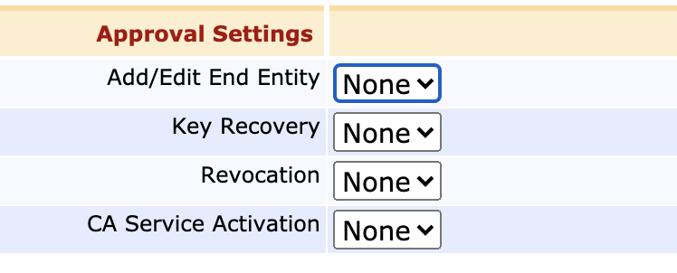 If you want to have several trusted administrators sign off on the issuance of a new CA certificate, configure Approval Profiles in the Approval Settings section.