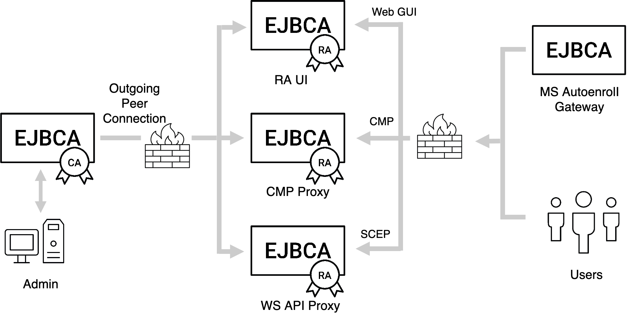 Using EJBCA you can connect an unlimited number of distributed RAs, communicating with the CA using standard protocols like CMP, SCEP and Web service. The RAs can be in the form of EJBCA components, custom-developed RAs, or standard products such as MdM or token management products. Security levels can be scaled up and down as in the previous example, and RAs can use different authentication means such as shared secrets, client certificate authentication, etc. The CA employs role-based access control to decide what each RA has access to perform. Multiple CAs can be easily configured to serve different purposes (VPN, MdM, TLS, etc).