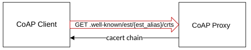 The CoAP proxy retrieves the alias configuration from EJBCA, which includes available aliases and CA certificate chains, at regular intervals. The frequency of this call can be adjusted in the coap.server.properties file. The CoAP client operation, to get the CA certificate chains is /crts.