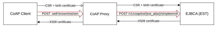 To enroll a vendor birth certificate, the CoAP client uses the simplified /sen operation, which is a form of the EST operation simpleenroll. The CoAP proxy transforms the request to a REST call formatted to utilize the EST protocol in EJBCA. For an EST request in client mode and vendor mode, the birth certificate and a Certificate Signing Request (CSR) must be included in the request, where the birth certificate is used for authentication. The details in the CSR must match the certificate details in the birth certificate for the CA to accept the request and issue a certificate.