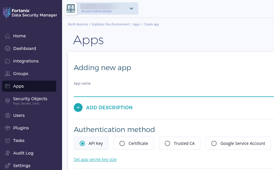 - In the Fortanix DSM, select your account, and then click Apps in the left menu.