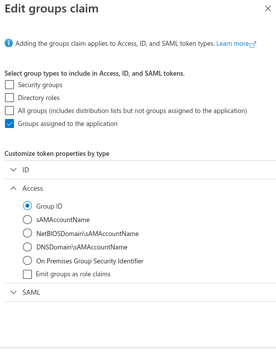 - Select Add groups claim and specify the following: