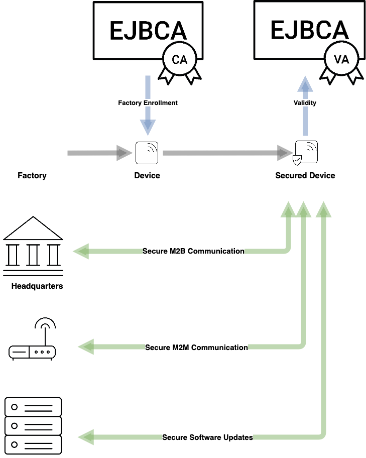 The following outlines two IoT PKI use cases and the next sections show some common steps to set up EJBCA for these use cases.