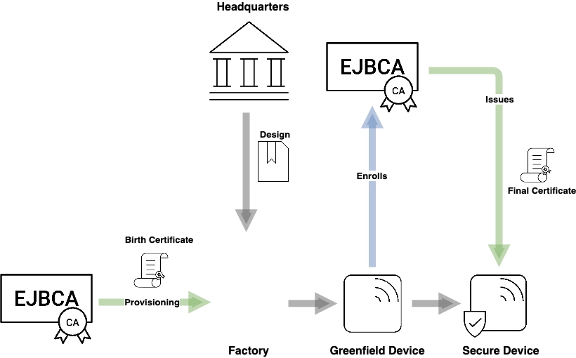 Generally, you may not fully control the production environment, having your devices or individual device components produced by a third party or a subcontractor. In this case, your priority is not only securing the connection between your device and the internet at large but also maintaining the integrity of the production line and being sure that nobody can produce counterfeit devices using your schematics. As is common in the telecom industry, devices may not be ready for enrollment upon production but need the means to securely enroll to the desired PKI upon deployment, often referred to as a Greenfield Deployment. Both these cases are solved by Identity Provisioning, making use of so-called birth certificates.