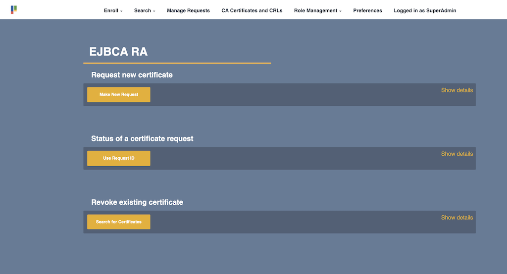 The quickest and easiest option for enrolling and issuing a certificate through EJBCA is by going through the RA UI, which can be accessed both on the Issuing CA instance or through a Registration Authority.