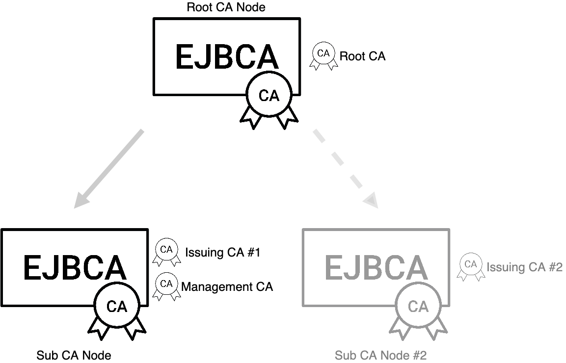 Initially, you need a minimum of four instances of EJBCA, one node acting as Root CA, one Sub CA node, a Registration Authority (RA) and a Validation Authority (VA). In addition, you're going to work with three CAs:
