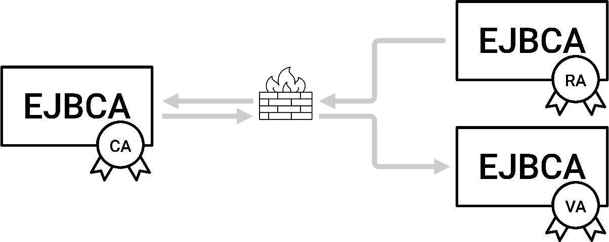 Domain security is of great importance. Your VAs will likely have to be exposed to the internet at large to supply CRLs and answer OCSP requests, while your RAs will at minimum have to be exposed internally to your general network to allow users and servers to enroll for certificates, or at worst to the internet at large if you're planning on issuing certificates to third-parties. While it might be tempting to simply have all your instances in the same domain, it is very much recommended to keep your CAs behind a one-way firewall, allowing only outgoing connections. EJBCA solves this using the Peers protocol, which not only uses mutually authenticated TLS but also has the CA initiate all connections.