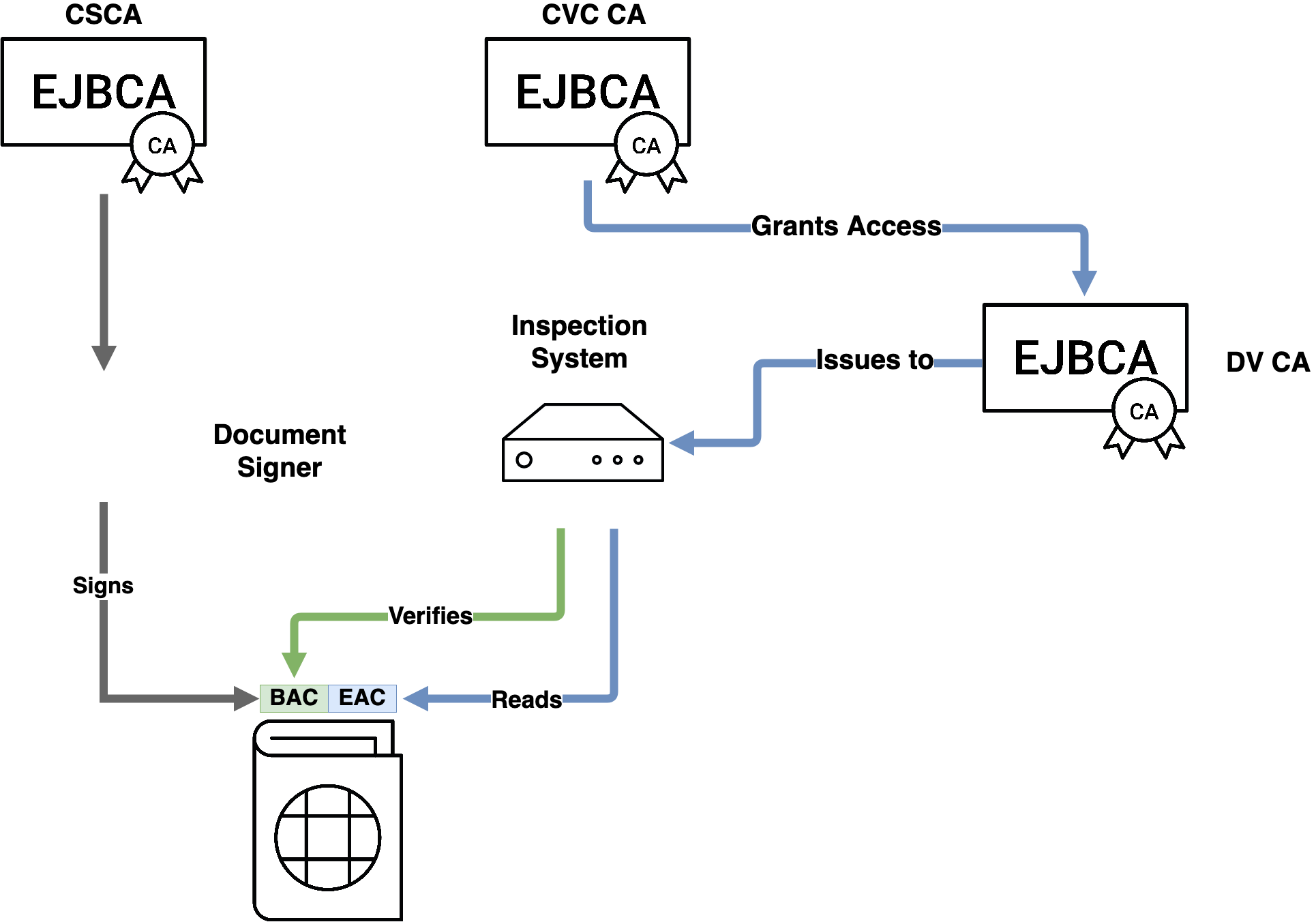 An extension of BAC, Extended Access Control also allows the passport to store biometric data such as fingerprints and iris/retinal scans. In order for partnering countries to authorize and control access to this data, each country needs to establish a CVC CA, that in contrary to the CSCA is based on the Card Verifiable Certificate (CVC) standard. To enable access, each country then needs to create a Document Verifier CA (DVCA), which is a Sub CA signed by the partnering country's CVCA. The DVCA can then issue certificates to Inspection Systems (IS) which are in turn authorized to read the protected fields in the ePassport's RFID chip. To facilitate the creation of Inspection Systems between countries, a Single Point of Contact (SPOC) is used.