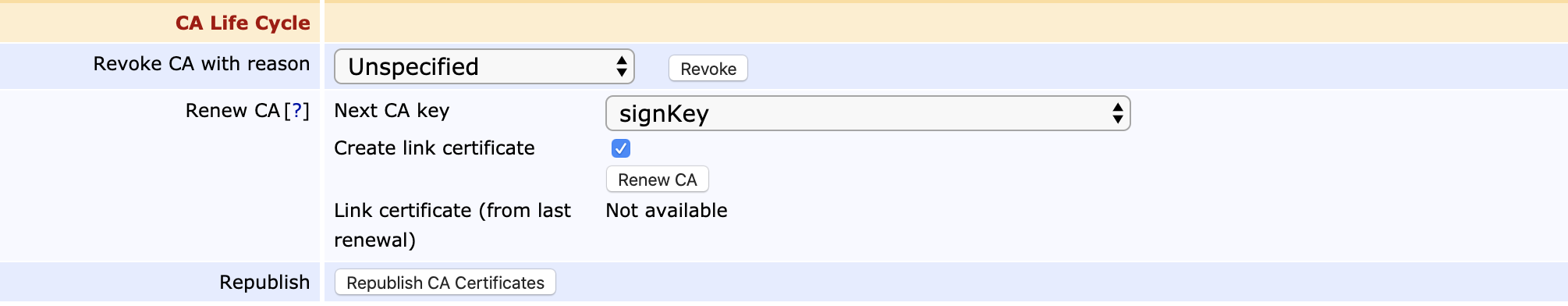 One way to handle update of trust points when renewing a Root CA is to generate a certificate that contains the new key signed with the old key. For X.509 CAs that are simply renewed (keeping the same CA subjectDN), you can create such a certificate by selecting Create link certificate before renewing the CA. The latest link certificate can then be downloaded from the Edit CA view. For CVC CAs a link certificate is always generated during the renewal.