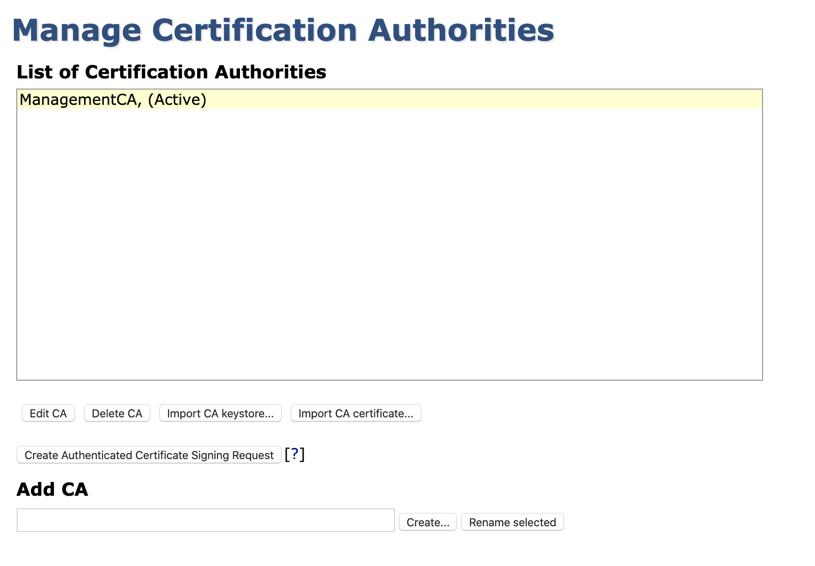This Certificate Authority Operations section provides information on managing CAs and instructions on how to create, renew, revoke, and import and export Certificate Authorities (CAs).