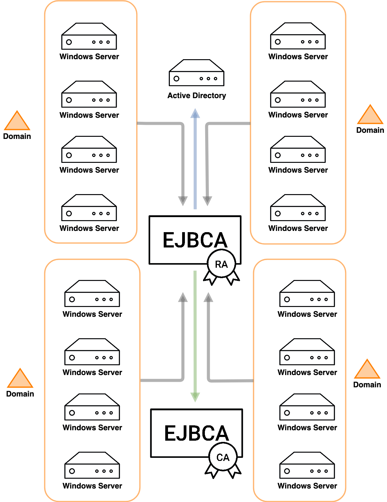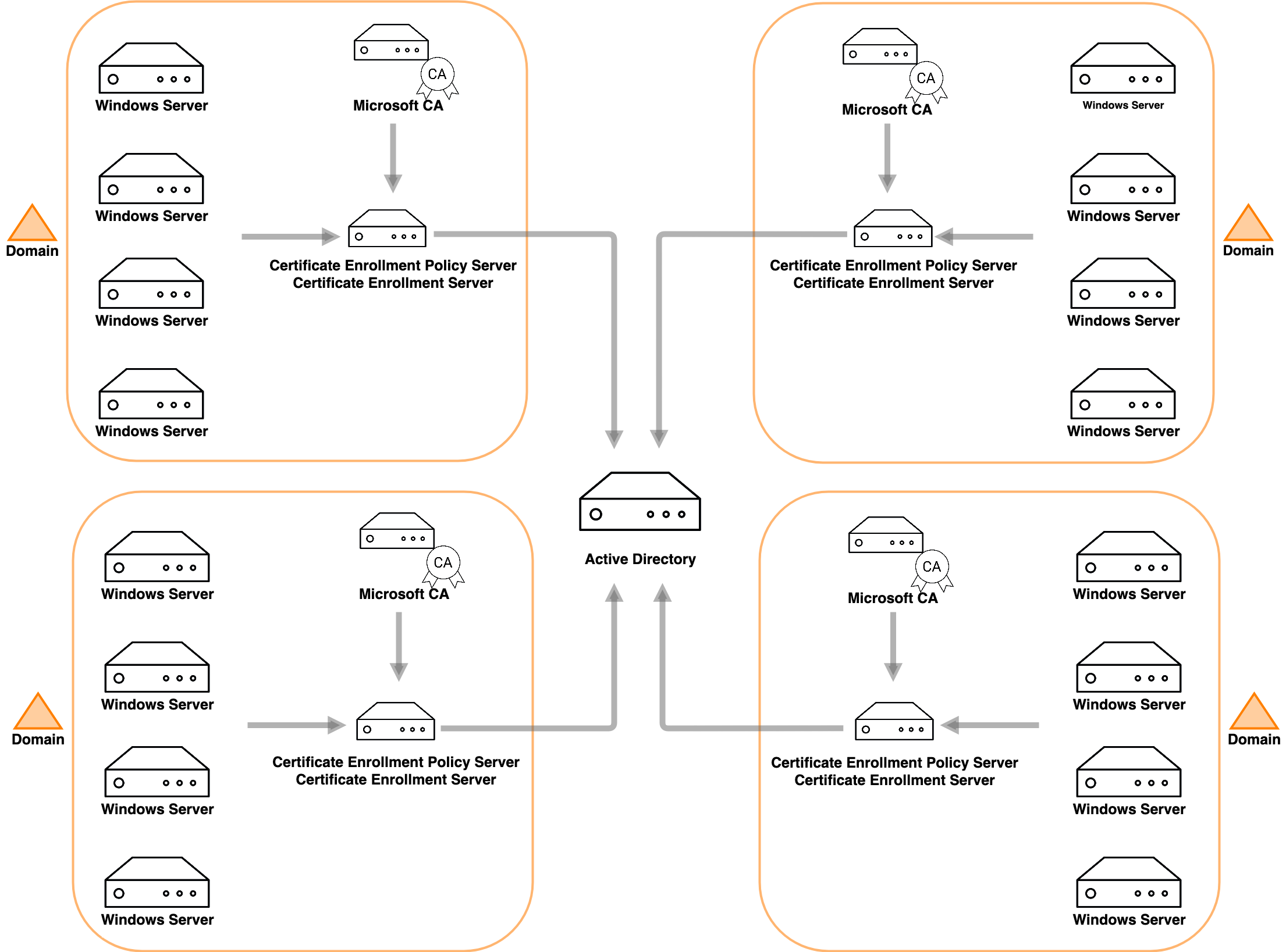 This is where EJBCA becomes your solution - by using the EJBCA CA instead of the Microsoft CA and configure the client to connect directly to EJBCA RA machines instead of a Microsoft Certificate Services, a single EJBCA CA can serve your entire Microsoft PKI through RA instances.
