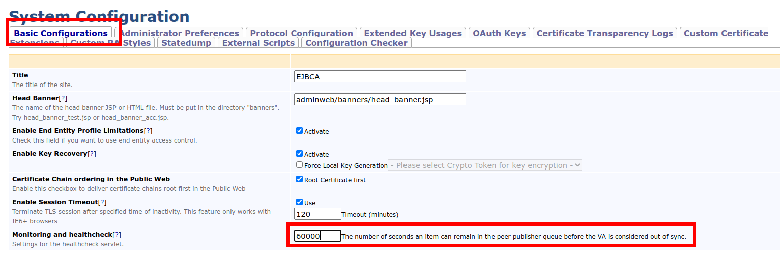 To achieve this, EJBCA offers a separate servlet that can be queried by a monitoring system (e.g. a load balancer). The servlet responds with a list of the VAs that are out of sync. A VA is considered out of sync if the peer publisher publishing to the VA has at least one item in its queue older than X seconds, where X is known as the VA status time constraint.
