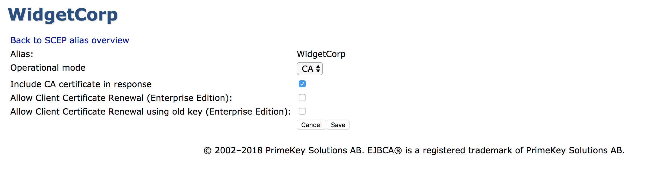 Allow Client Certificate Renewal using Old Key | enterprise The SCEP draft does not mandate if old keys may be reused for Client Certificate Renewal or not, so EJBCA includes this as a setting. |