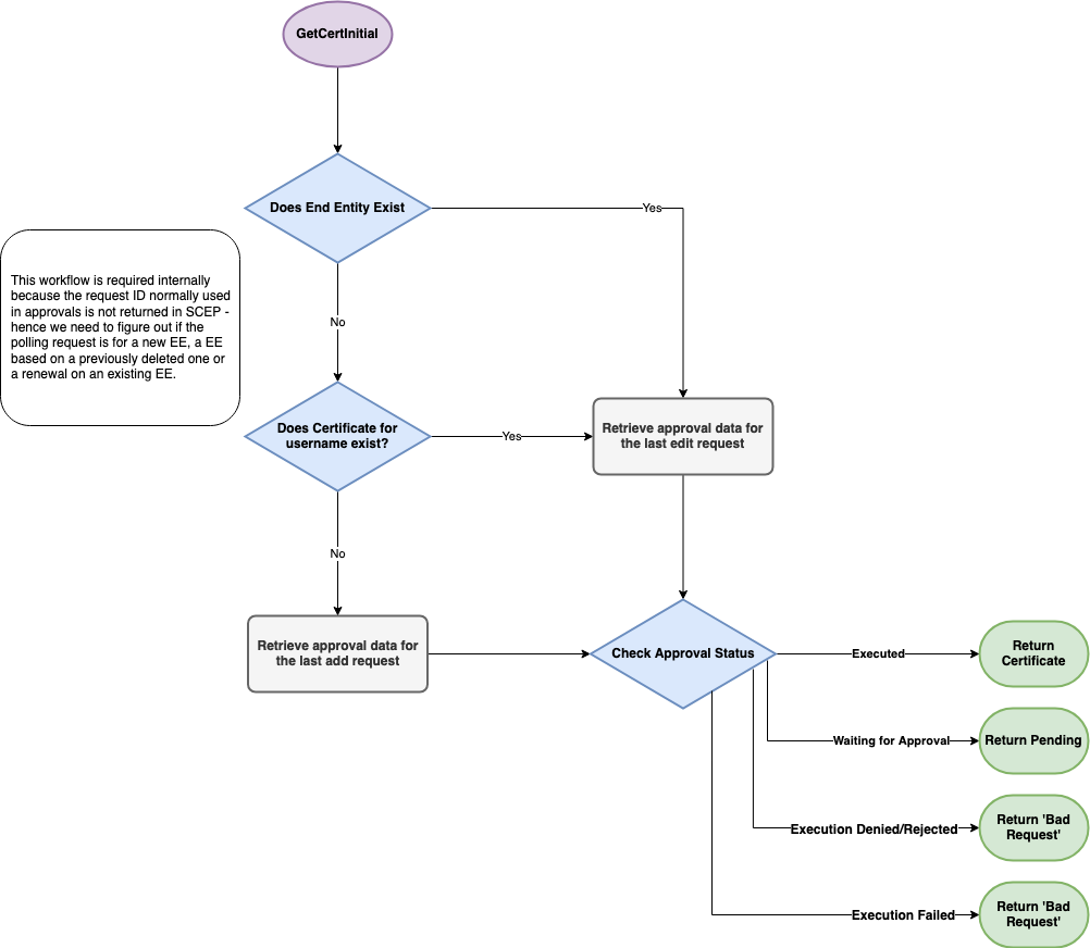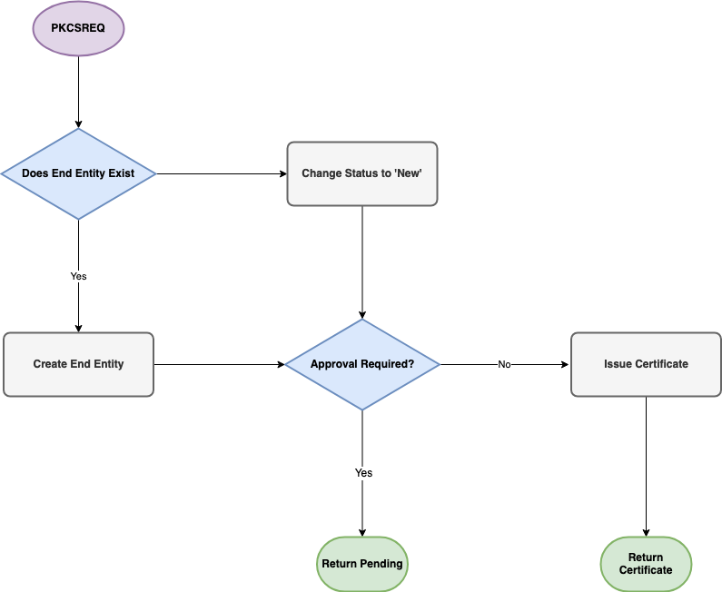 The following graphs document the internal workflow of EJBCA when processing SCEP requests. Worth noting is that sending a PKCSREQ message on an existing end entity with issued certificate will result in a request for renewal.