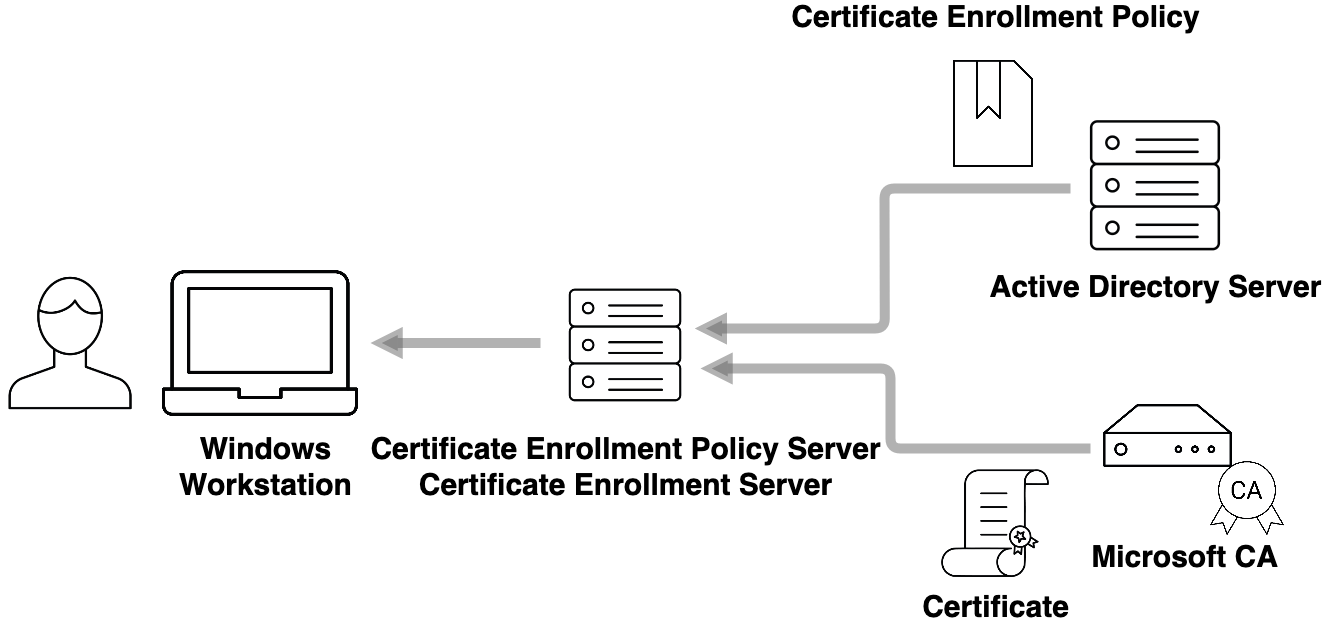 When a client running Windows logs into a domain, it makes a request to a Certificate Enrollment Policy Web Service (CEP) to retrieve from the AD what policies the user is entitled to. A request is then sent through a Certificate Enrollment Web Service (CES) to request certificates from the Microsoft CA, which in turn gives access to the needed domains. This process is called Microsoft auto-enrollment and it works so well that you are not even aware that it's happening.