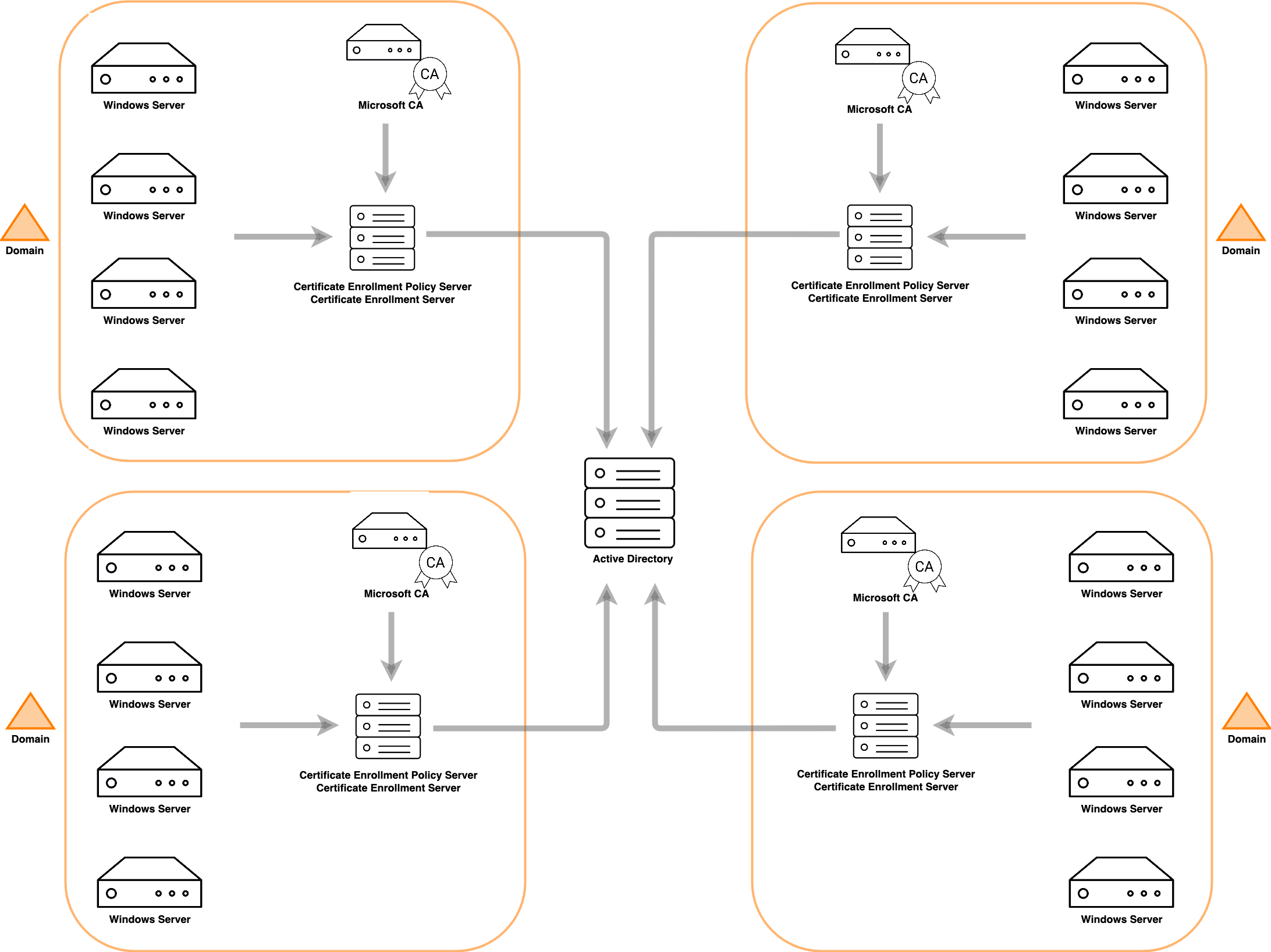 While this solution works well in small-scale environments, once multiple domains and forests need to be taken into consideration it scales poorly, requiring an equal number of CEP and CES servers and Microsoft CA instances to the number of domains.