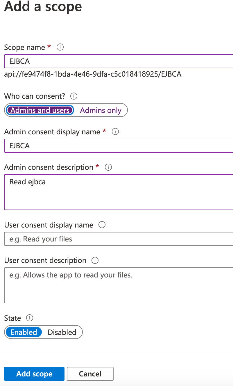 - This shows that the Scope is api://fe9474f8-1bda-4e46-9dfa-c5c018418925/EJBCA
