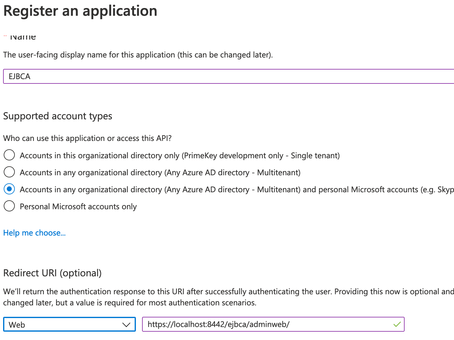 To add the OAuth Provider in EJBCA and find the values for the different fields in the Azure portal, perform the steps below.