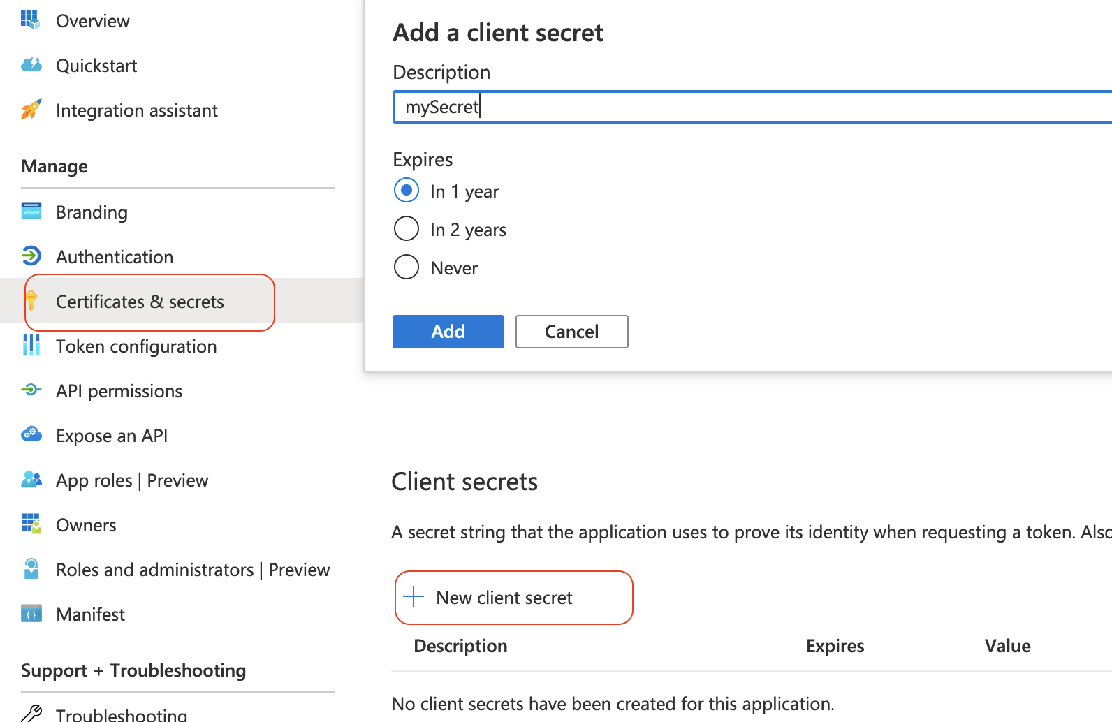 - Go to Certificates & secrets in Azure and click Upload certificate. Select the PEM file downloaded above and click Add.