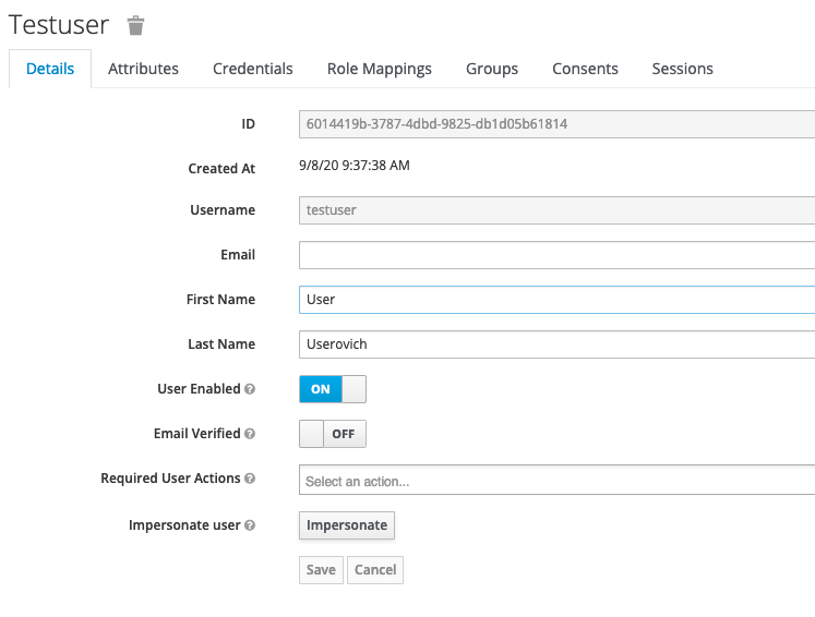 - In the Keycloak Admin Console, click Users>Add User.