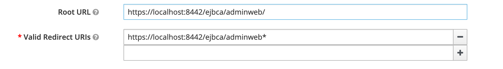 - Set Valid Redirect URIs to https://localhost:8442/ejbca/adminweb*