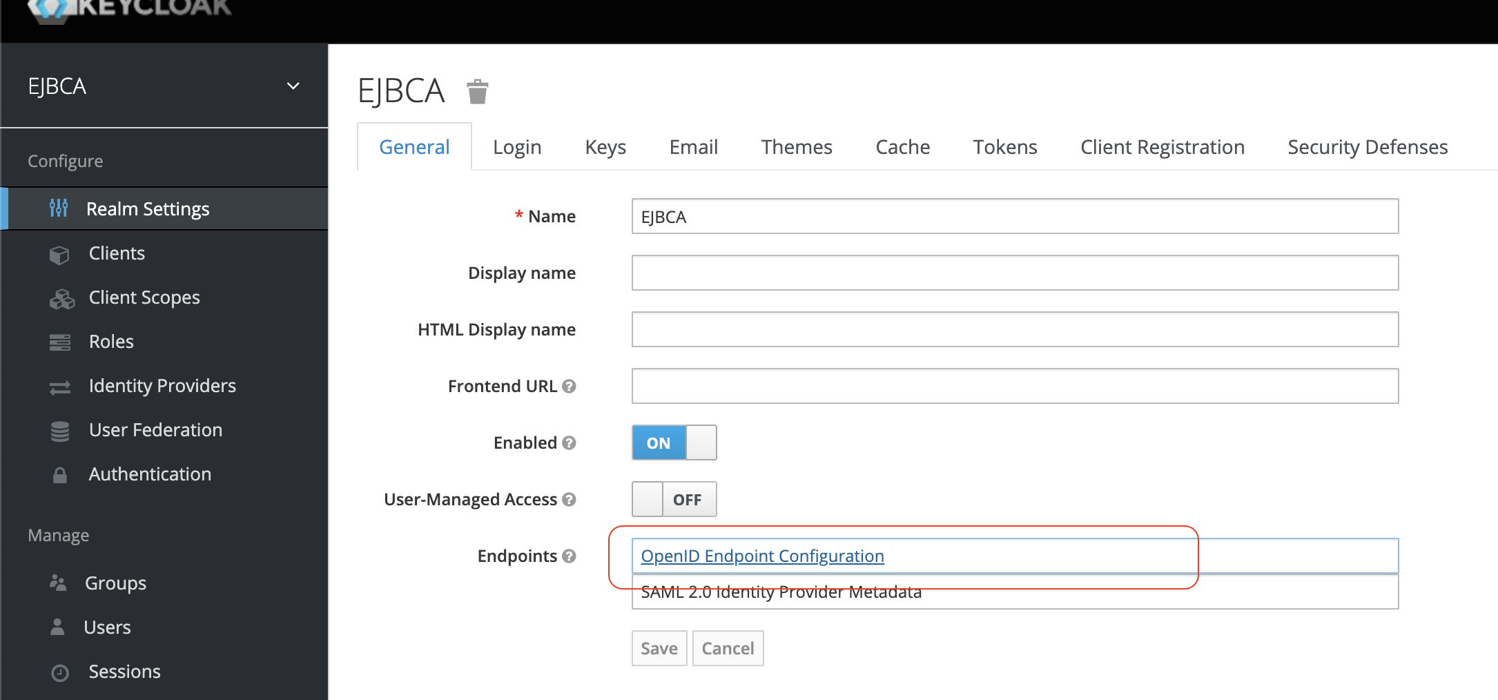 In the Keycloak Admin Console click Realm Settings > General and open Endpoints url