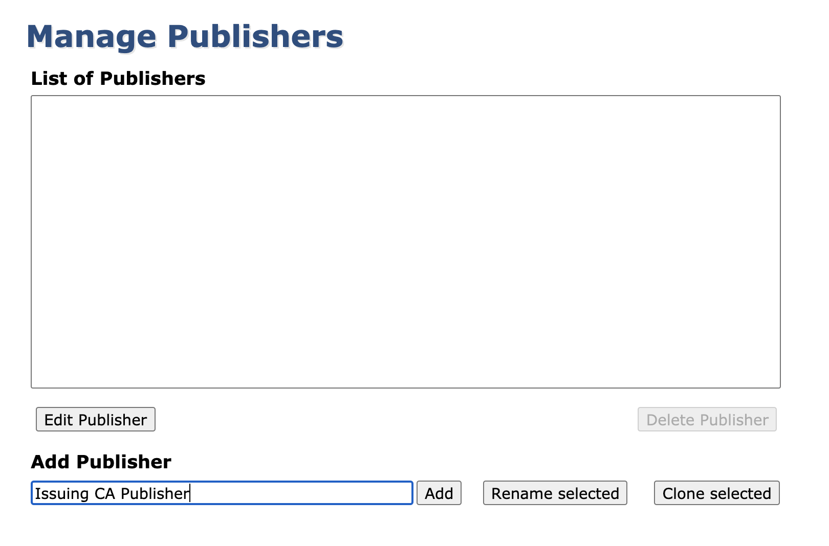 - On the CA instance, click Publishers under CA Functions to open the Manage Publishers page.