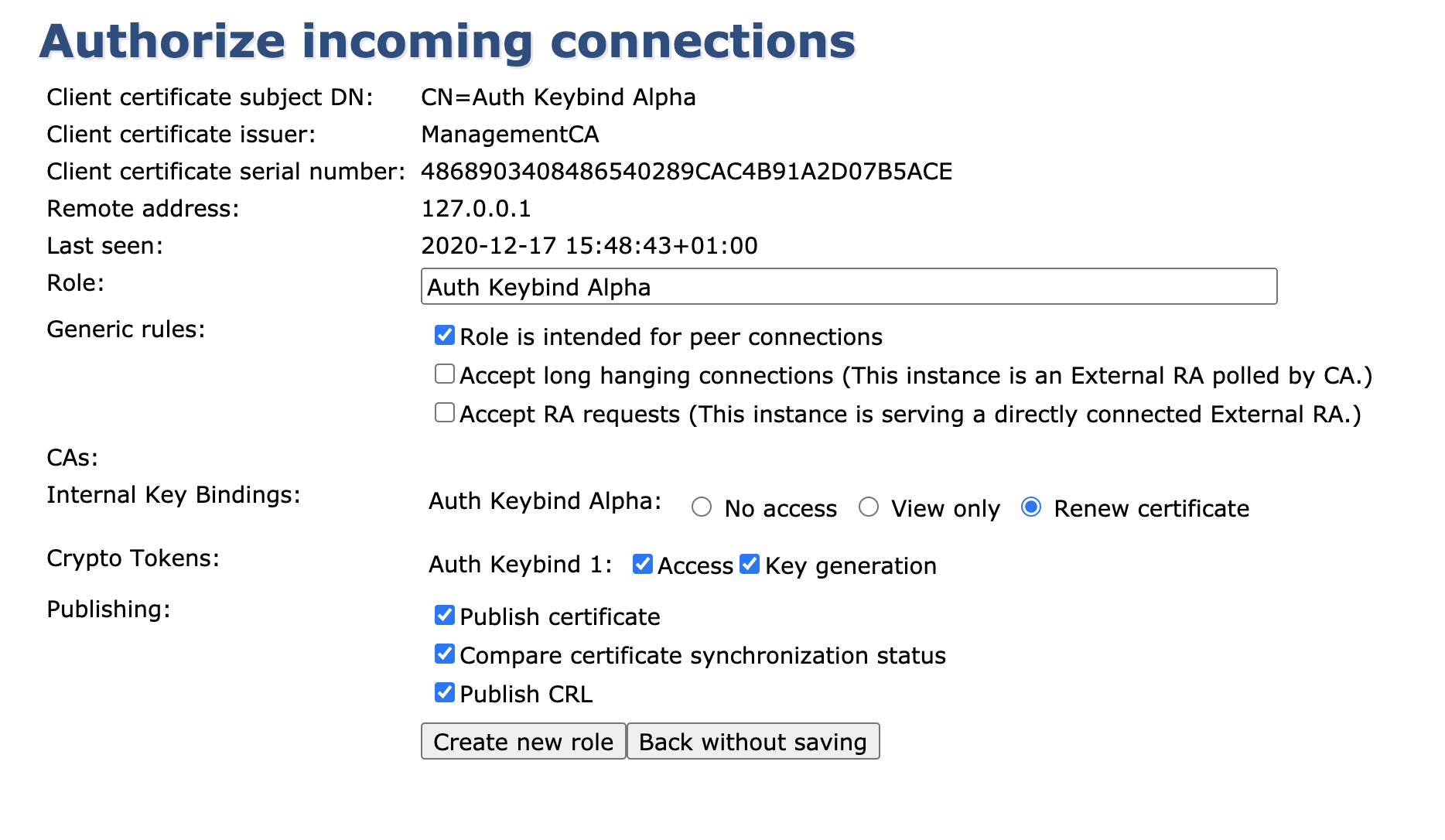 Since EJBCA requires authentication for even internal processes between nodes (in order to strengthen domain security and allow multi tenancy), there needs to be a Role created that matches the certificate defined in the CA's Authentication Key Binding. To create a role: