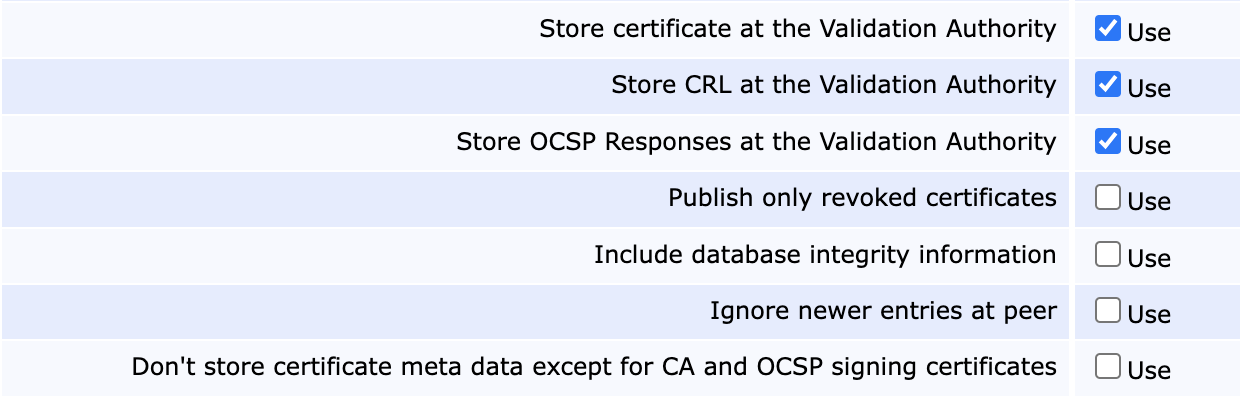 Store OCSP Responses at the Validation Authority | If pre-signed OCSP responses are enabled on the CA, this publisher will also store those on the VA. Note that this setting will make standard OCSP publishing redundant. |